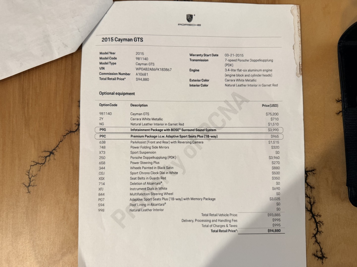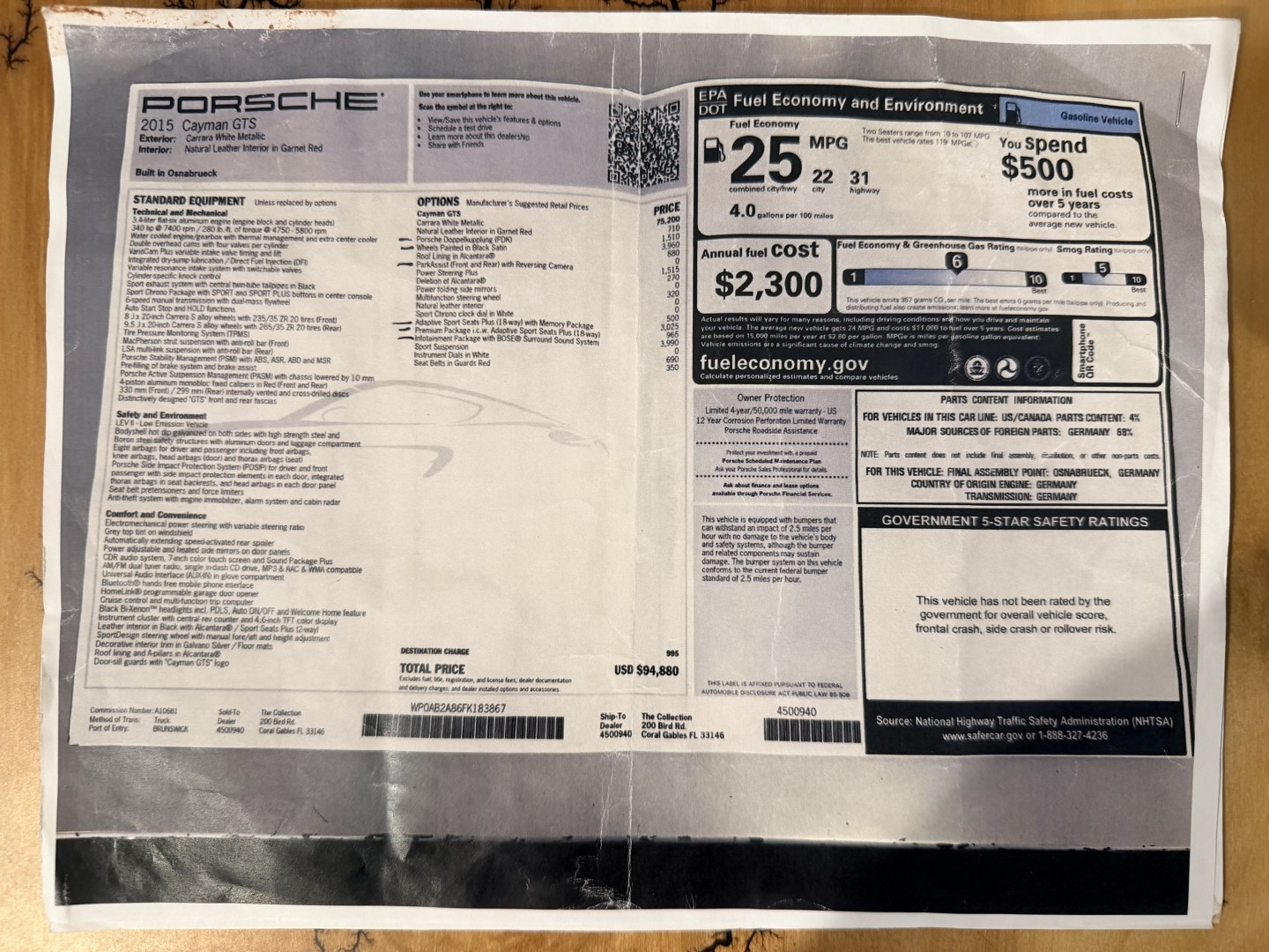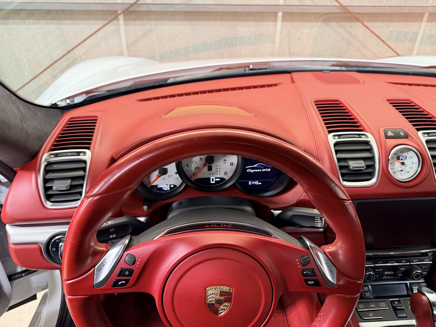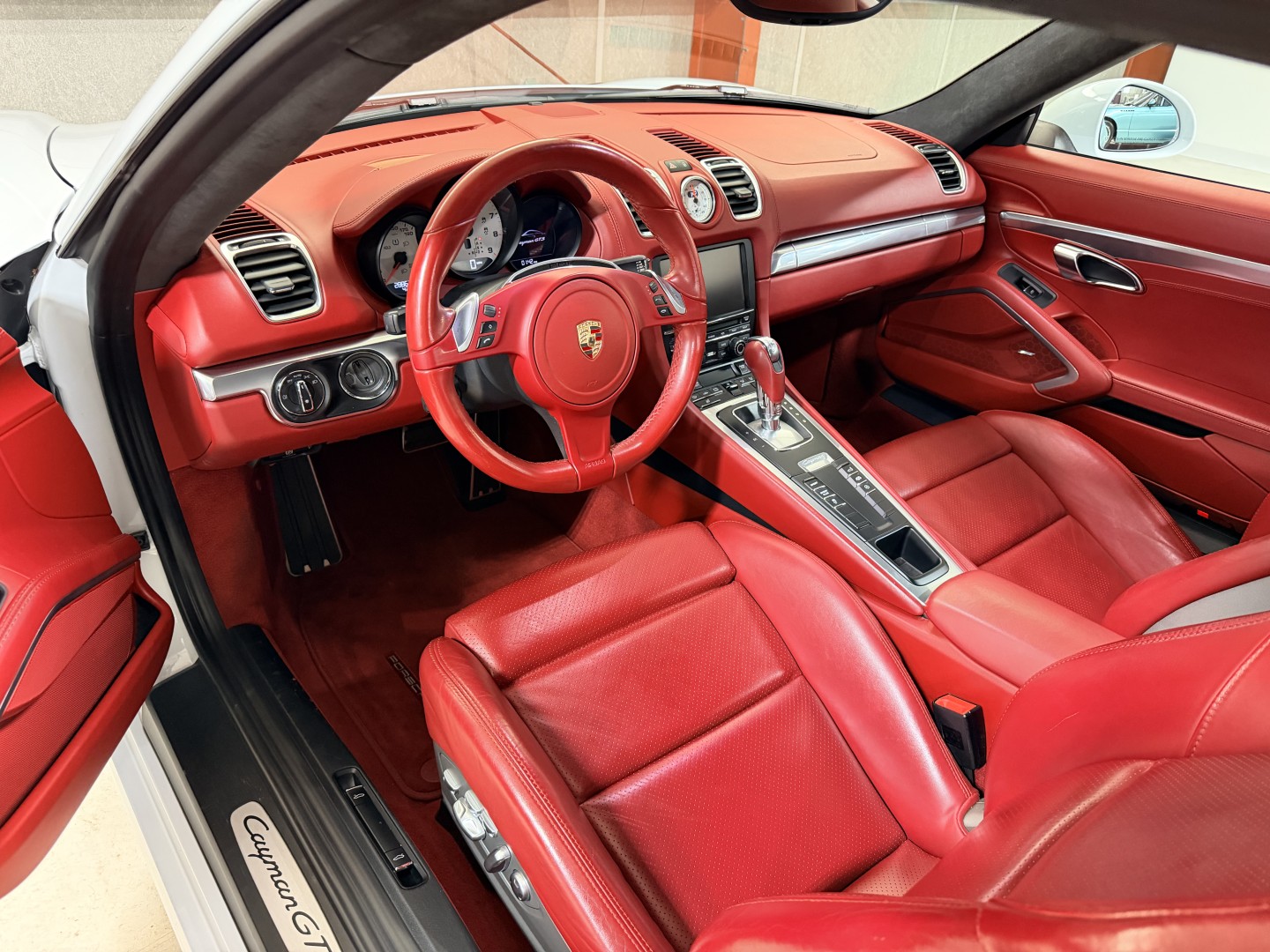 2015 Porsche Cayman GTS with just under 29k miles! Finished in Carrara White exterior over Garnet Red natural leather interior w/adaptive sport seats. Power is provided by a 3.4-liter naturally aspirated flat-six paired with a 7-speed PDK dual-clutch transmission.