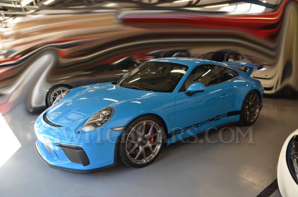 Paint-to-Sample Mexico Blue 2018 GT3 with the 6-speed manual transmission. Original owner car with less than 1000 miles and in perfect condition. The car is all original paint with a clean Carfax, and the entire front end, mirrors, door edges, and rocker panels are protected with top-quality clear film. The car is bone stock and has never been tracked. NOTE: pictured with aftermarket wheels, these are not included - vehicle will be sold with the original factory wheels which have just delivery miles on them. Also the Porsche side and rear stickers can easily be removed if new owner prefers. Car includes all books, both keys, and original window sticker.