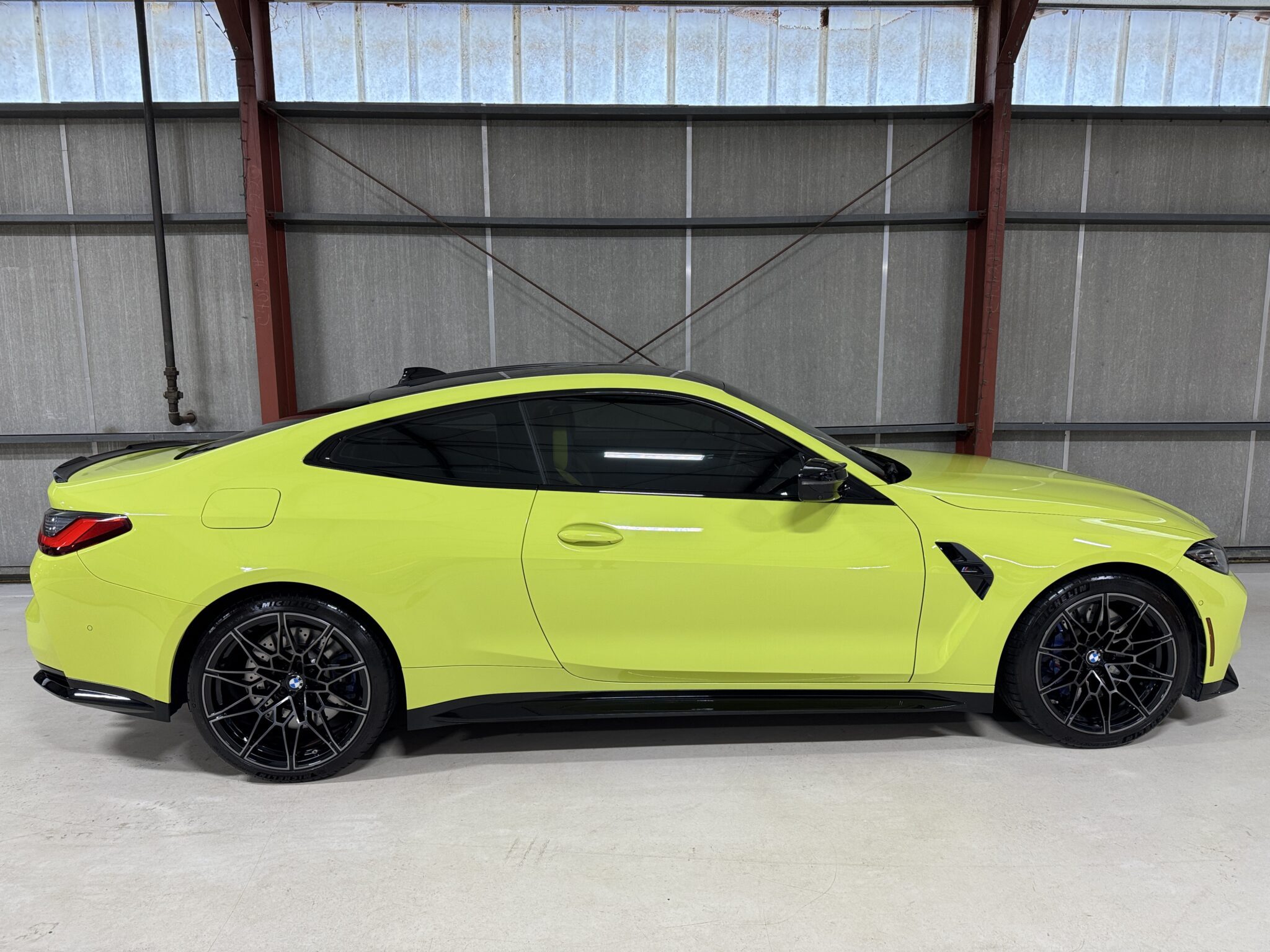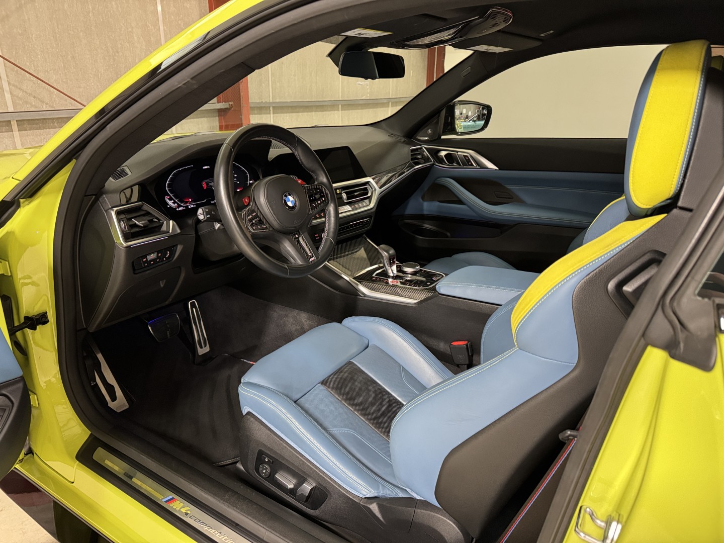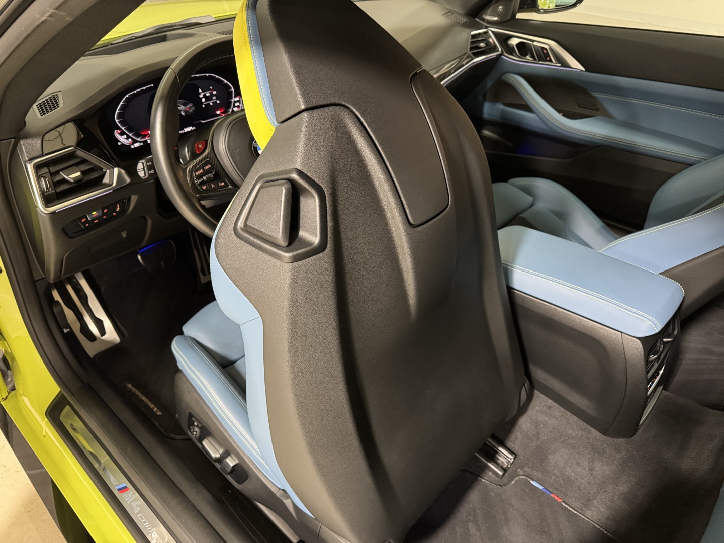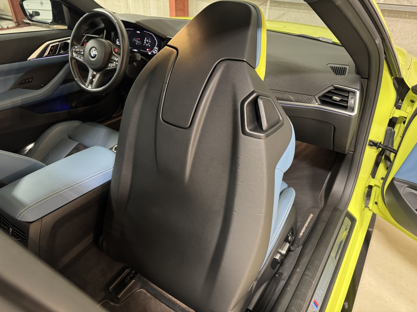 2022 BMW M4 Competition xDrive now available with just under 32,000 miles. The exterior is finished in Sao Paulo Yellow over a Yas Marina Blue/Black extended leather interior. Power comes from a 503-horsepower S58 3.0-liter twin-turbocharged inline-six paired with an 8-speed M Steptronic transmission. Factory options include the Parking Assistance Package, Executive Package, M Shadowline Lights, carbon fiber interior trim, and front ventilated seats.